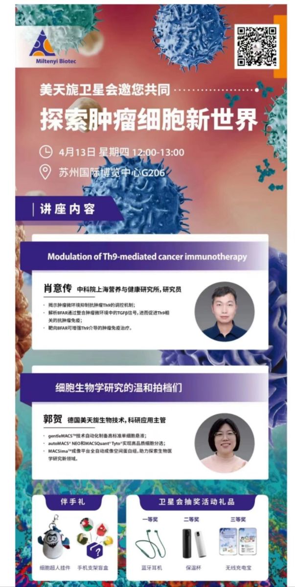 中國細胞生物學會第十八次代表大會暨2023年全國學術大會于4月10-14日在蘇州市舉行。本次大會主要分為學術交流(大會特邀報告、分會場報告、衛星會議、墻報交流等)、工作會議、暖場活動和特色活動多種形式。分會場交流共分為27個主題開展學術交流。其中美天旎公司還特邀中科院肖意傳博士開展了“探索腫瘤細胞新世界”的相關講座。