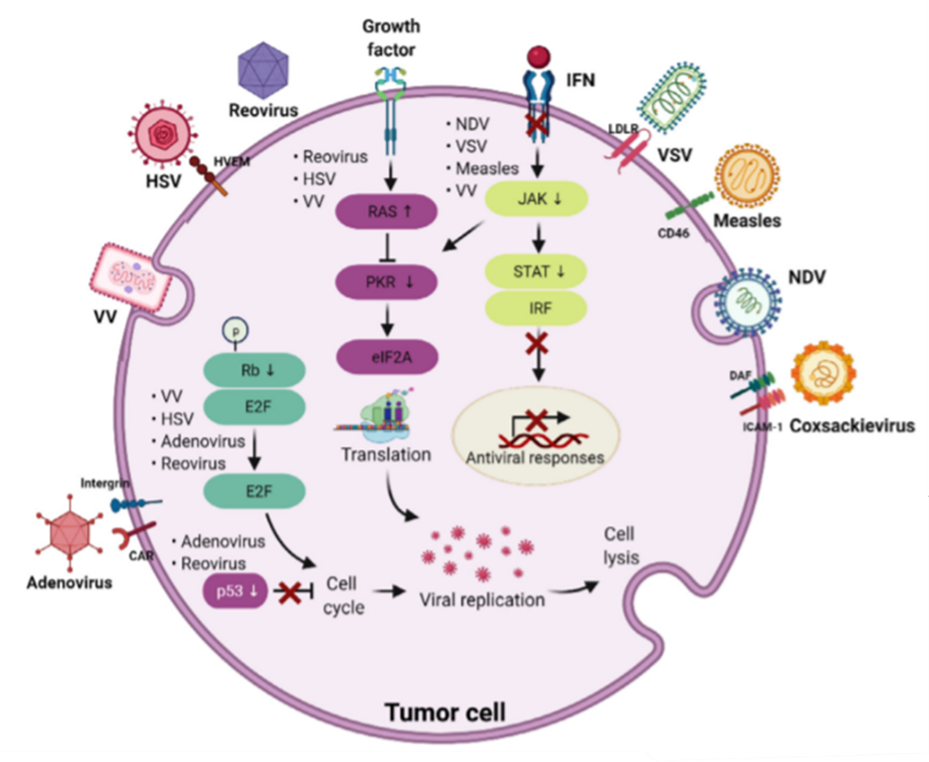 靶向機(jī)制:無論是天然病毒還是經(jīng)基因改造過的病毒,都是通過腫瘤細(xì)胞與正常細(xì)胞之間遺傳特征和表觀遺傳的差異(如原癌基因激活、抑癌基因失活、腫瘤細(xì)胞表面某些受體高表達(dá)、缺氧酸性的腫瘤微環(huán)境以及信號(hào)通路異常等),來實(shí)現(xiàn)對(duì)腫瘤細(xì)胞的選擇性感染和在腫瘤細(xì)胞內(nèi)的選擇性復(fù)制。比如腦膠質(zhì)瘤細(xì)胞高表達(dá)CD155,而脊髓灰質(zhì)炎病毒則能識(shí)別并結(jié)合CD155由此進(jìn)入腫瘤細(xì)胞;腫瘤細(xì)胞中有缺陷的IFN表達(dá)或p53突變也可作為靶向途徑,正常細(xì)胞被溶瘤病毒感染后可激發(fā)IFN表達(dá)/p53介導(dǎo)的細(xì)胞凋亡從而清除病毒,腫瘤細(xì)胞則因IFN缺陷及p53突變失去抗病毒能力;而針對(duì)在多種腫瘤細(xì)胞中高表達(dá)的尿激酶受體,則可對(duì)溶瘤病毒進(jìn)行基因改造,在病毒表面引入能夠結(jié)合尿激酶受體的抗體/受體,從而特異性識(shí)別腫瘤細(xì)胞;此外,也可以在病毒基因組里插入腫瘤特異性的啟動(dòng)子,如人端粒酶逆轉(zhuǎn)錄酶 (hTERT)啟動(dòng)子、癌胚抗原 (CEA) 啟動(dòng)子、甲胎蛋白 (AFP)啟動(dòng)子等來實(shí)現(xiàn)病毒僅在腫瘤細(xì)胞內(nèi)復(fù)制。