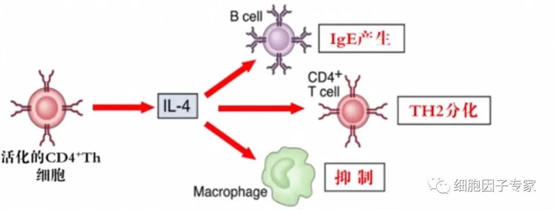 誘導Th2細胞;刺激活化B、T、肥大細胞的增殖;上調B細胞、巨噬細胞MHC II類分子和B細胞的CD23;下調IL-12產生從而抑制Th1分化;增強巨噬細胞胞吞作用;誘導免疫球蛋白切換至IgG1和IgE。 |