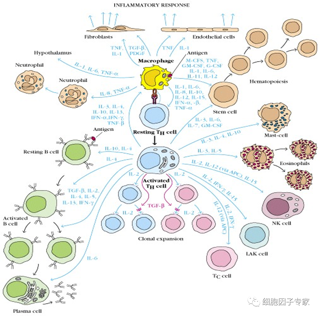 細胞因子是由免疫細胞(如單核、巨噬細胞、T細胞、B細胞、NK細胞等)和某些非免疫細胞(內皮細胞、表皮細胞、纖維母細胞等)經刺激而合成、分泌的一類具有廣泛生物學活性的小分子蛋白質。具有調節固有免疫和適應性免疫、血細胞生成、細胞生長、APSC多能細胞以及損傷組織修復等多種功能。