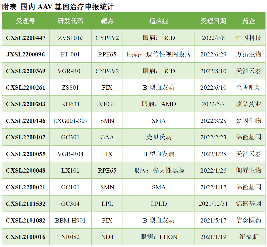 國內方面,已經累計申報13款AAV基因療法,其中2021年3款,2022年10款,呈快速增長的趨勢。